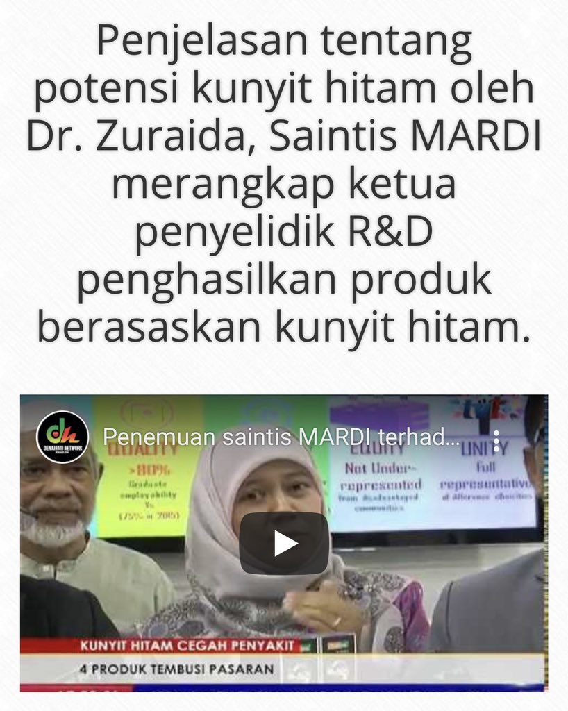 Kajian ini melaporkan penggunaan ekstrak kunyit hitam sehingga 135 gram setiap hari adalah selamat. Namun begitu dalam kunyit hitam kandungan bioaktif fitokimia ini adalah sehingga 5-7 iaitu satu nilai yang sangat tinggi. SERDANG - Institut Penyelidikan dan Kemajuan Pertanian MARDI hari ini menegaskan bahawa ia tidak mempunyai kaitan dengan produk kunyit hitam produk DR4 yang dipasarkan syarikat Volten.